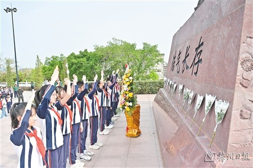 在梅州市紅色文化公園(劍英公園)山頂紀(jì)念廣場,少先隊員參加清明祭英烈活動。(圖片來源:梅州日報 鐘小豐 攝)