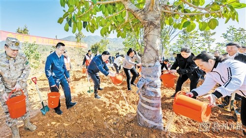 馬正勇、楊朝暉、陳金鑾等市領導在興寧市黃槐鎮(zhèn)四望嶂廣東省特色文旅研學基地項目現(xiàn)場,參加全省推進綠美廣東生態(tài)建設義務植樹活動。(連志城 攝)