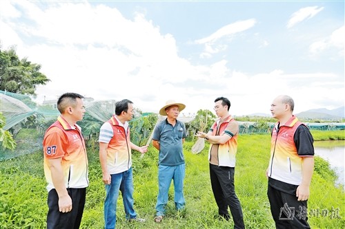 廣州市荔灣區(qū)駐梅縣區(qū)畬江鎮(zhèn)幫鎮(zhèn)扶村工作隊在畬江鎮(zhèn)咸和村了解產(chǎn)業(yè)發(fā)展情況。(吳麗伶 攝)