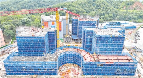 記者了解到,在項(xiàng)目主體結(jié)構(gòu)施工過程中,項(xiàng)目團(tuán)隊(duì)通過不斷優(yōu)化施工部署、加大資源配置,投入管理人員60多人、工人近400人和各類機(jī)械設(shè)備、車輛80多臺,配合4天一層的施工周期,保持高效推進(jìn)。工程采用國標(biāo)盤扣滿堂支模架,標(biāo)準(zhǔn)化施工,最大程度提高了施工效率。面對客家風(fēng)格復(fù)雜的山墻屋頂造型,項(xiàng)目技術(shù)團(tuán)隊(duì)反復(fù)研究論證,并以BIM建模輔助,科學(xué)優(yōu)化支模方案,克服了高難度模板搭設(shè)和混凝土澆筑施工難點(diǎn)。