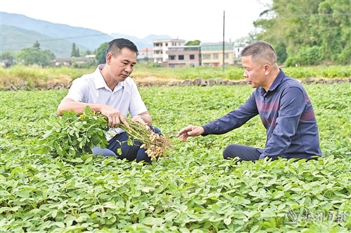 種植大戶黃純?nèi)A(右)和東石鎮(zhèn)明洋村黨支部書記劉寶申在檢查東石花生的生長情況。