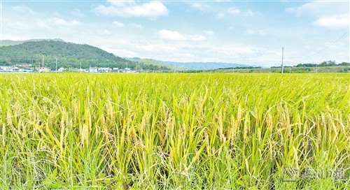 蕉嶺縣新鋪鎮(zhèn)尖坑村連片的農(nóng)田稻浪翻滾,稻穗顆粒飽滿。