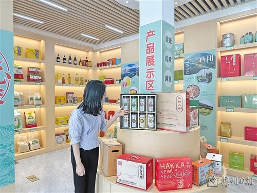桃坪金花茶、嶂下五谷雜糧、塘青蜜柚……走進位于西陽鎮(zhèn)鄉(xiāng)村振興服務(wù)中心首層的農(nóng)特產(chǎn)品展示中心,當(dāng)?shù)馗魇礁鳂拥霓r(nóng)特產(chǎn)品整齊地擺放在展架和展臺上。