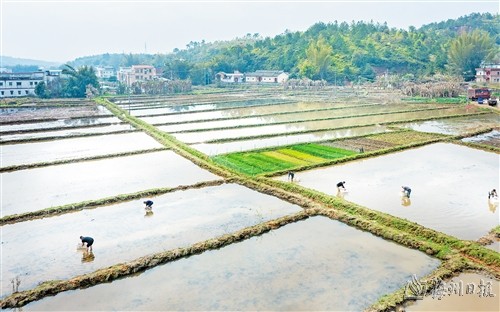 興寧市蓮億農(nóng)業(yè)有限公司的工人在新圩鎮(zhèn)新豐村的湖洋田里進行湘蓮春種作業(yè)。(連志城 攝)