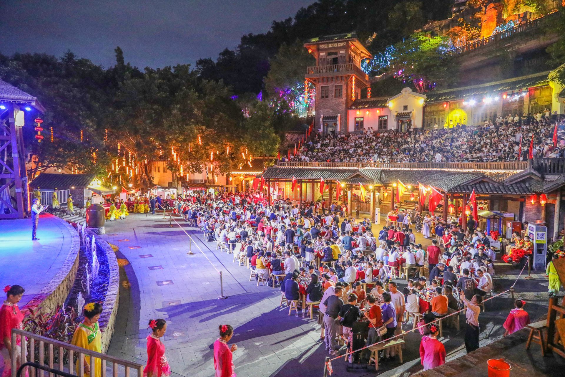 梅州客天下旅游度假區(qū)舉辦“梅州圍龍宴”,八仙桌在記憶廣場(chǎng)一字排開(kāi),數(shù)百名賓客紛至沓來(lái)。(吳騰江 攝)