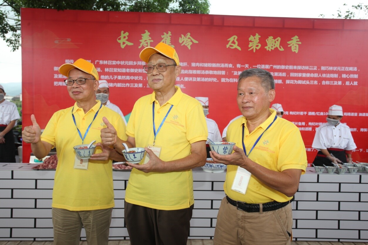 謝晉元將軍之子謝繼民,梅州市人民政府副市長曾尚忠,蕉嶺縣委書記、廣東梅州蕉華工業(yè)園區(qū)黨委書記陳偉明等領(lǐng)導(dǎo)嘉賓參加了本次“粵菜(客家菜)師傅”工程展區(qū)活動。展區(qū)內(nèi)設(shè)置了主題面板,向來賓們介紹了“三及第”的歷史由來,并在現(xiàn)場擺放了10余道色香味俱全的傳統(tǒng)客家特色小吃,包括釀粄、煎粄、炒粄、味酵粄等風味米制食品,更直觀的向大家展示了客家特色小吃的獨特魅力。謝繼民先生為我縣“三及第”等客家美食表示肯定和稱贊。接著,由客家菜師傅現(xiàn)場制作蕉嶺特色美食,包括三及第、糍粑等,現(xiàn)場吸引了眾多人的觀賞學(xué)習,與“客家菜師傅”共同探討烹飪技巧?!盎洸藥煾怠痹谂腼兂鲆坏烂裆坝膊恕钡耐瑫r,也“烹制”出了鄉(xiāng)村振興、農(nóng)旅結(jié)合、脫貧攻堅的“色、香、味、形”。最后,現(xiàn)場參會群眾開始盡情品嘗客家傳統(tǒng)美食,讓現(xiàn)場香飄四溢,民眾紛紛稱贊。本次活動不僅讓大家感受到了客家小吃的獨特風味,更是向社會大眾進一步弘揚了客家飲食文化的獨特魅力。