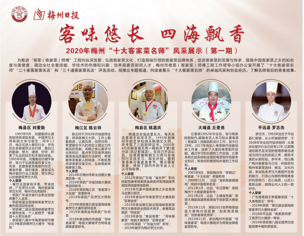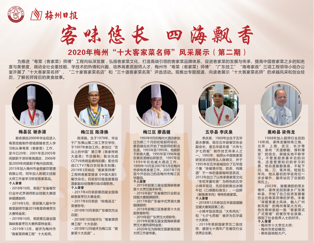 據(jù)悉,去年年底,市人社局和市餐飲協(xié)會(huì)、各縣(市、區(qū))人社局我市范圍內(nèi)開(kāi)展了“十大客家菜名師”“二十家客家菜名店”“三十道客家菜名菜”評(píng)選活動(dòng)。在經(jīng)歷各縣(市、區(qū))推薦、市人社局組織以國(guó)務(wù)院特殊津貼專家、中國(guó)烹飪大師、市餐飲協(xié)會(huì)執(zhí)行會(huì)長(zhǎng)陳鋼文先生為組長(zhǎng)的專家組進(jìn)行復(fù)評(píng)后,評(píng)選出了“十大客家菜名師”“二十家客家菜名店”“三十道客家菜名菜”。