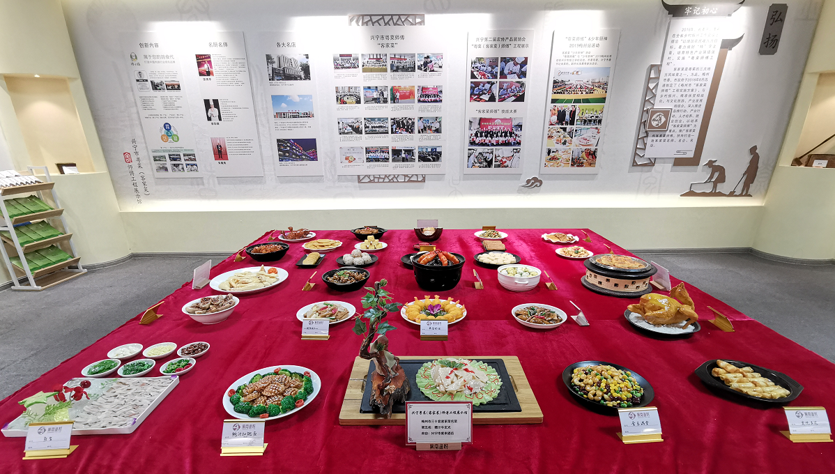 走進展館內(nèi),只見一桌桌興寧客家傳統(tǒng)宴席有序擺放,賞燈宴席、喜宴宴席等模型在燈光的照耀下熠熠生輝,令人垂涎欲滴。興寧粵菜(客家菜)師傅工程展館展示區(qū)域由經(jīng)歷、匯集、傳承、弘揚四個專欄組成,通過場景、實物、模型、圖文、資料、聲像等手段,集中展示了興寧客家菜的歷史淵源、制作技巧、食品薈萃和傳承創(chuàng)新。