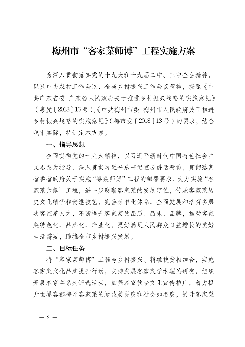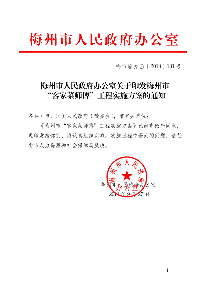 《梅州市人民政府辦公室關(guān)于印發(fā)梅州市“客家菜師傅”工程實施方案的通知》梅市府辦函〔2018〕181號