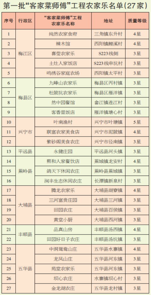 2018年8月,我市首批14家星級農(nóng)家樂出爐,興寧市的葉南漁村成為唯一獲評五星級的農(nóng)家樂。2019年3月,梅江區(qū)純?nèi)晦r(nóng)家食府等13家農(nóng)家樂被評為星級農(nóng)家樂。至此,我市共評定27家三星級及以上農(nóng)家樂,并授予“‘客家菜師傅’工程農(nóng)家樂”牌匾。(劉曉娟)