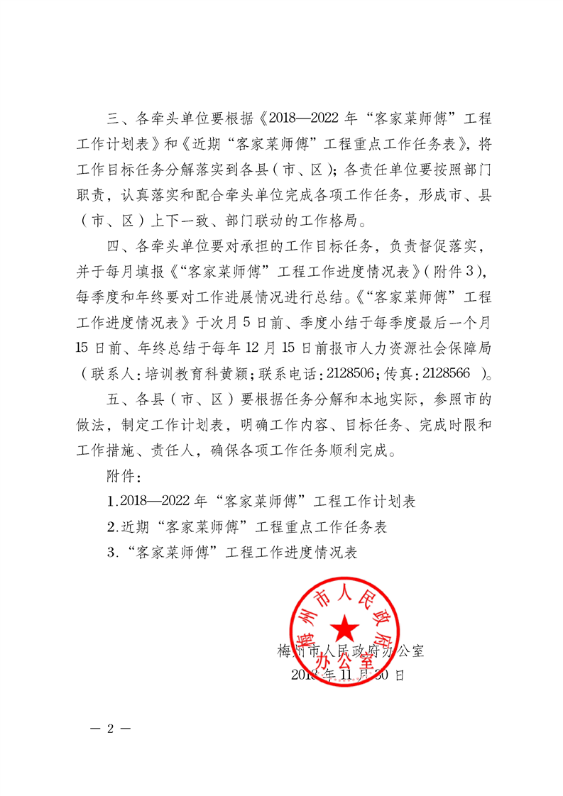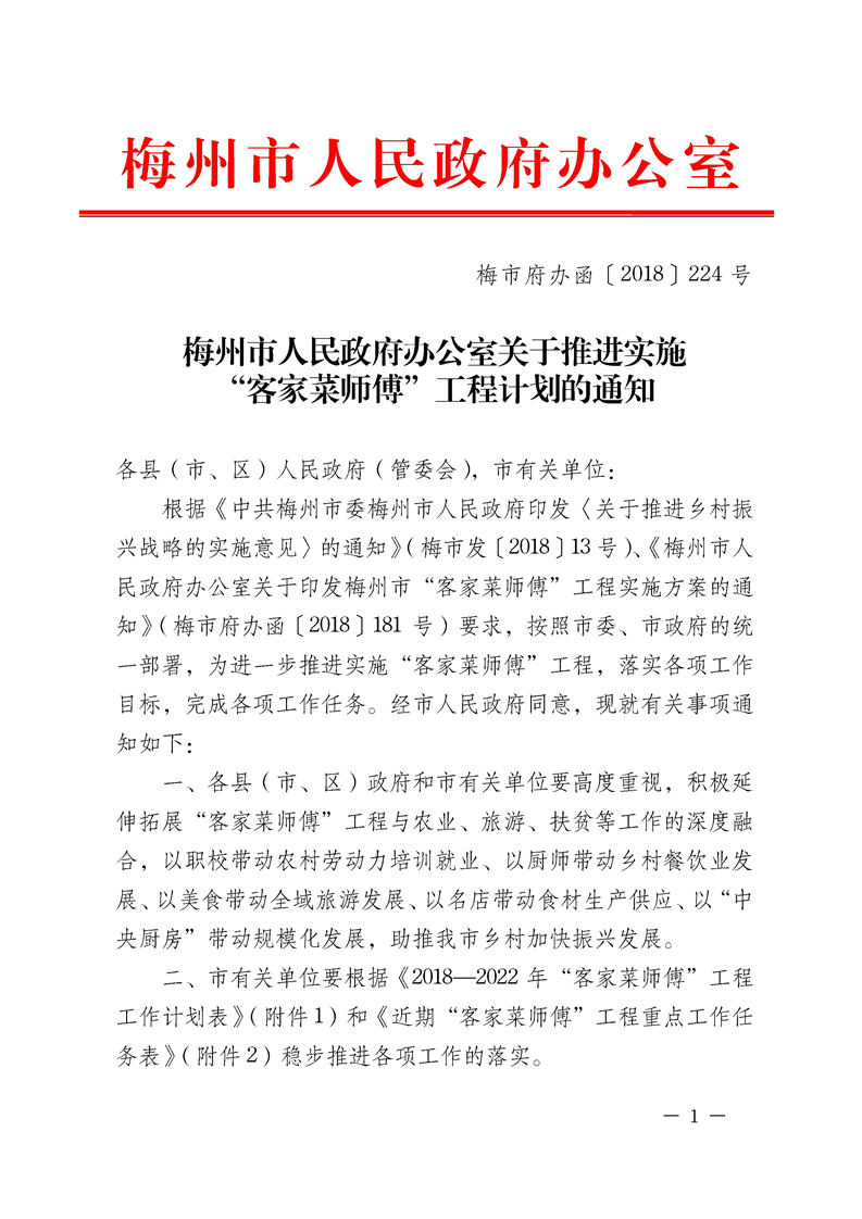《梅州市人民政府辦公室關(guān)于推進實施“客家菜師傅”工程計劃的通知》梅市府辦函〔2018〕224號