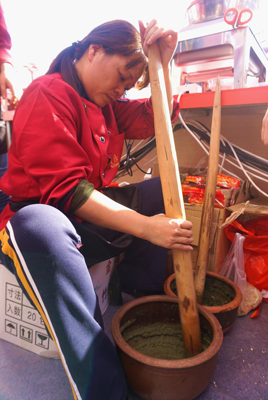 小禺兒在梅州五華客家美食攤位上看到,有客家擂茶、客家鹽焗雞、釀腐衣、七夕藥粄、艾粄、娘酒雞、客家豬肉丸、牛肉丸、烤高山紅薯等十多種特色美食。攤位的主人盛情地邀請(qǐng)小禺兒喝一碗客家擂茶。