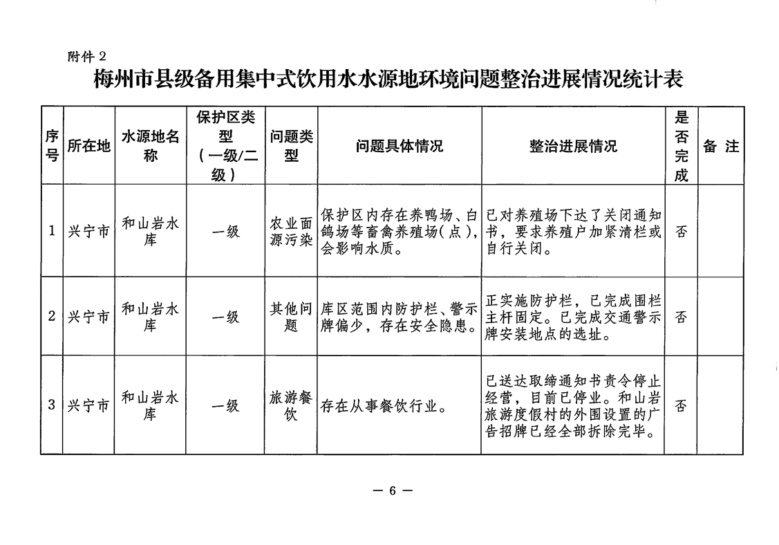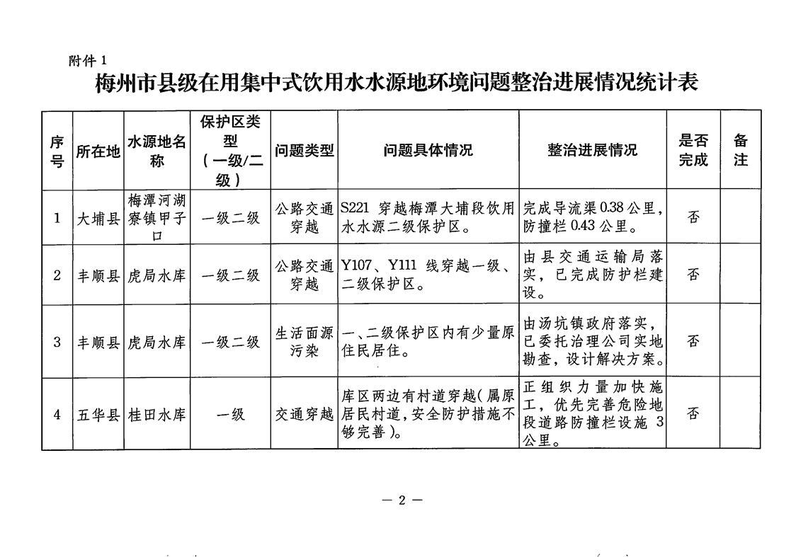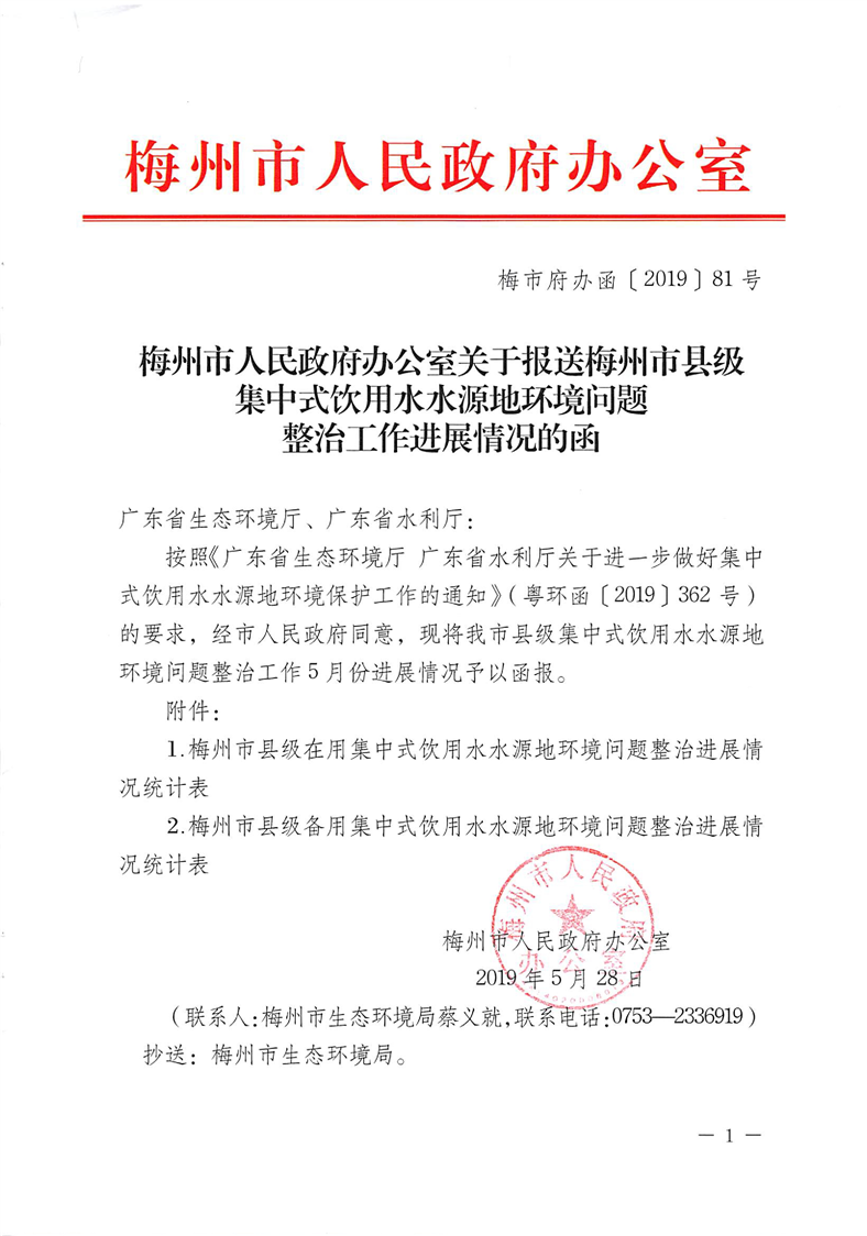 關(guān)于報(bào)送梅州市縣級(jí)集中式飲用水水源地環(huán)境問題整治工作進(jìn)展情況的函(5月)