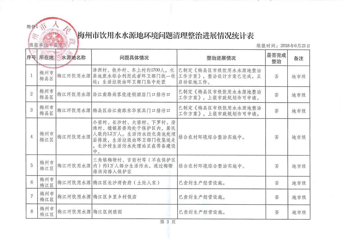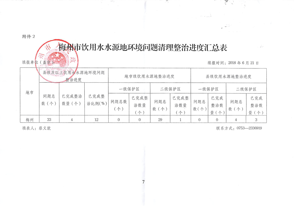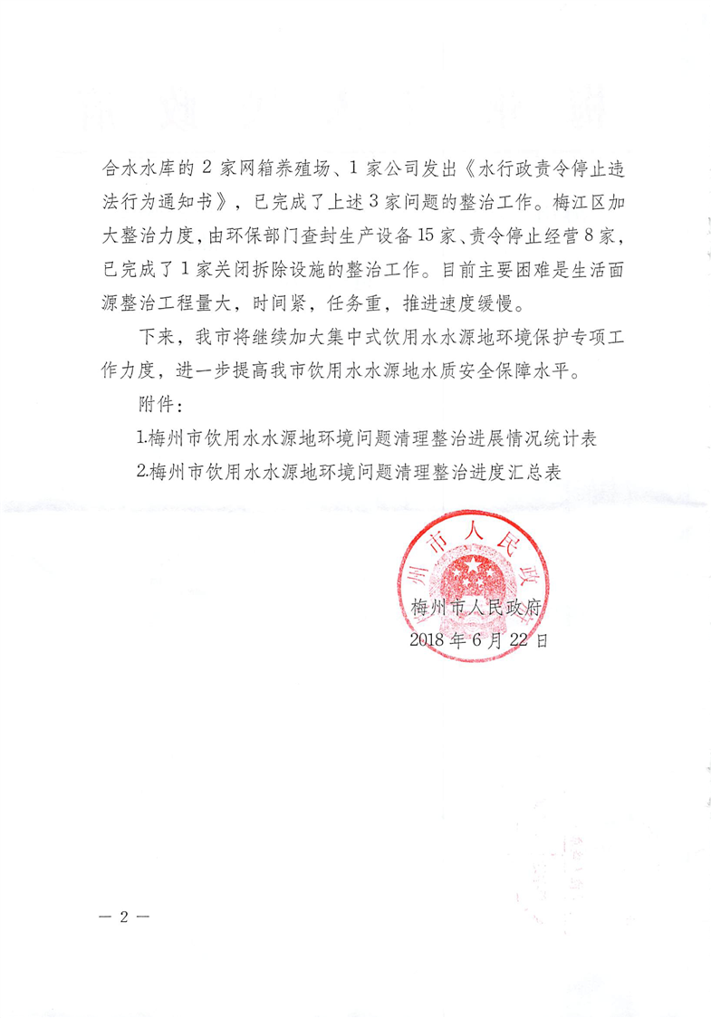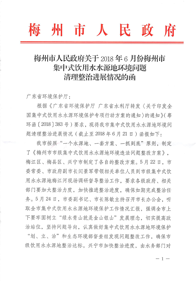 梅州人民政府關(guān)于報(bào)送梅州市集中式飲用水水源地環(huán)境問(wèn)題清理整治進(jìn)展情況的函